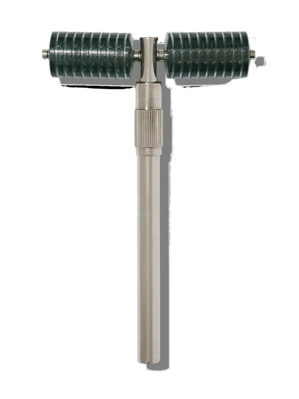 A hand-held rolling device with a smooth action double roller head embedded with durable 0.1mm stainless steel micro-needles for use on the body.